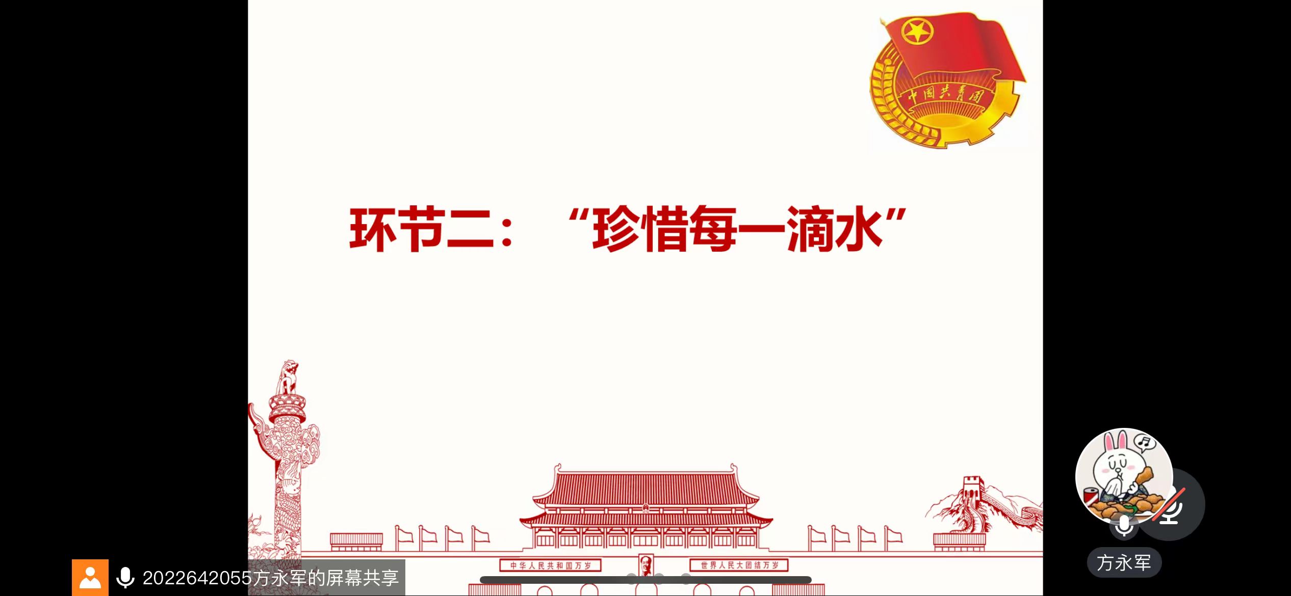 首先,团支部书记方永军播放了一则介绍世界水日与中国水周由来的视频。1993年1月18日,第47届联合国大会确定每年3月22日为世界水日,其宗旨是唤起公众的节水意识,加强保护水资源。自1993年“世界水日”确定后,从1994年起,水利部决定将每年“世界水日”即3月22日至3月28日的这一周,确定为“中国水周”,提高全社会关心水、珍惜水、保护水和水忧患意识,促进水资源的开发、利用、保护和管理。支部团员明白了世界水日与中国水周的建立是为了提高公众珍惜和保护水资源的意识。