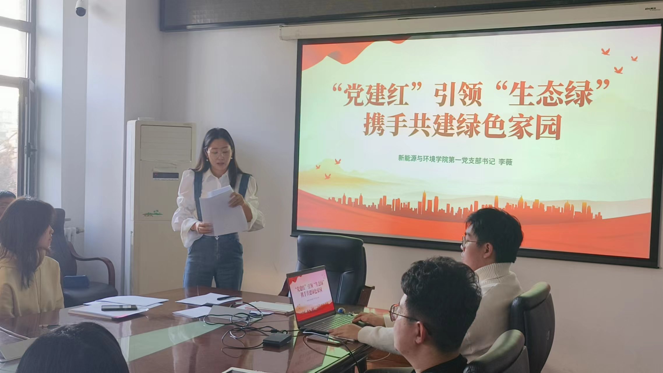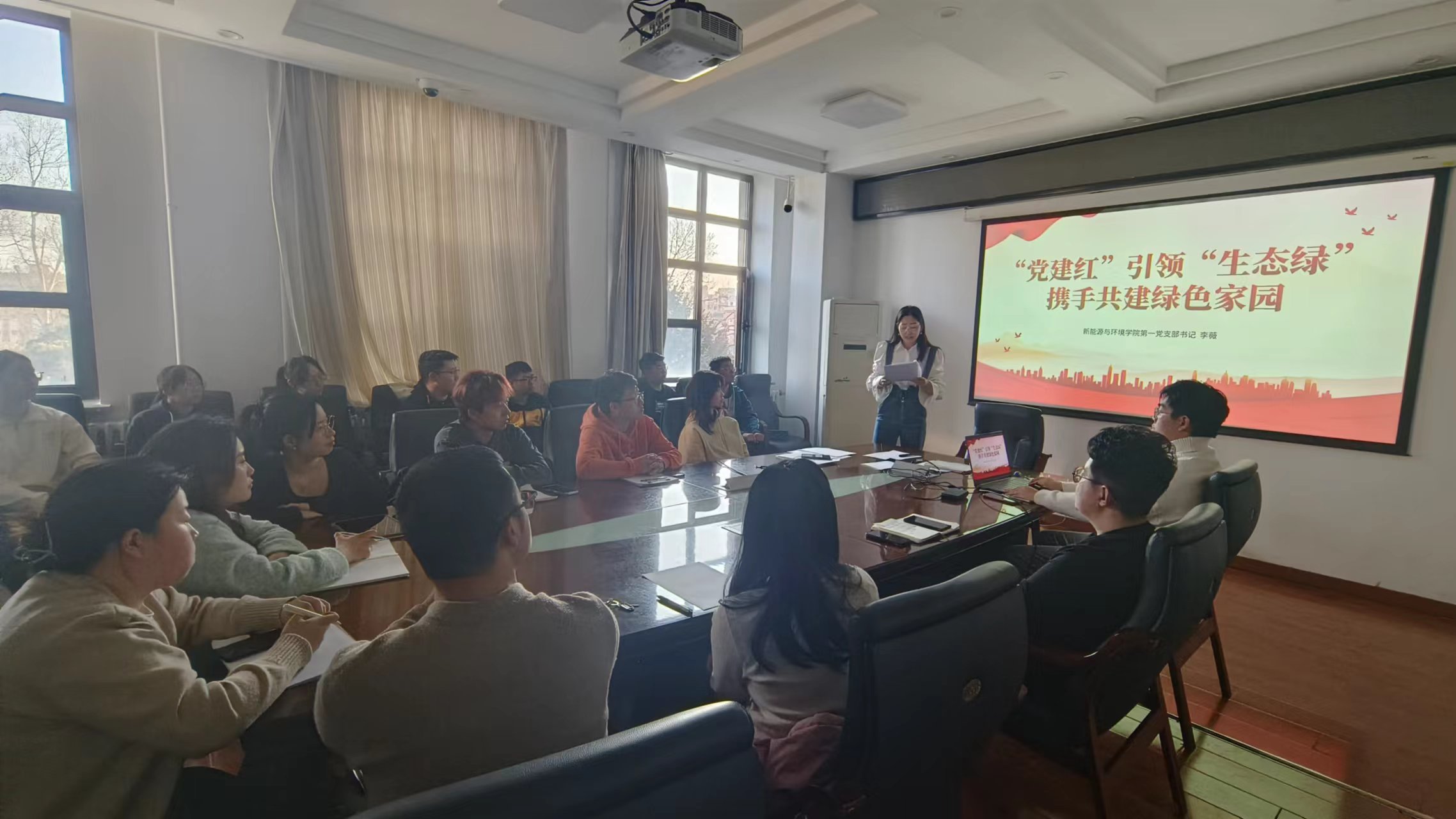 第十四届全国人大代表大会第二次会议开幕会上,国务院总理李强代表国务院作《2024年政府工作报告》,报告从7个方面进行了2023年的工作回顾,指出了2024年经济社会发展总体要求和政策取向,明确了2024年政府十项工作任务,全文涉及多处“生态文明建设”相关内容。活动中,李老师带领党员同志们共同研读了本次报告,强调了我党对强化生态环境保护治理提出的新要求新举措,重点讲述了2024年政府工作任务中“加强生态文明建设,推进绿色低碳发展”的相关内容。为了让同学们更直观的学习,李老师组织与会党员共同观看《生态文明,全球共赢》短片,进一步学习了解近平生态文明思想精神深刻含义。2020年,习近平总书记在第七十五届联合国大会上对世界郑重承诺:“中国将提高国家自主贡献力度,采取更加有力的政策和措施,二氧化碳排放力争于2030年前达到峰值,努力争取2060年前实现碳中和。”为实现这一庄严承诺,向世界人民展现大国担当,全国人民在党中央的带领下,建设节能工程和低碳产业,深入开展污染防治攻坚战。