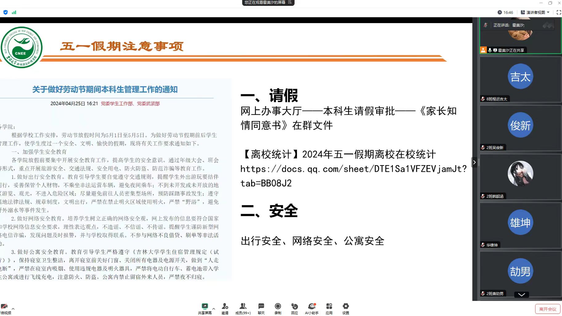 此外,各年级辅导员根据本年级具体情况进行专项工作布置。2020级年级大会由吴哲书记主持,霍美汐老师就网上签约、三方协议及学生档案的转接等工作进行部署,吴老师提醒同学们关注个人毕业论文进度,同时详细解答了不同就业类别同学个人档案邮寄的问题。2021级辅导员李薇老师针对学生职业发展与就业规划展开指导,建议同学们在求职和升学中的面试环节提前准备中英文自我介绍,根据不同场合选择合适的服装,在给面试官留下良好第一印象的同时顺利通过面试。2022级母茂松老师提醒学生注意劳逸结合,利用假期时间,充分调整个人健康作息,多进行户外运动,确保能够安全、健康地享受即将到来的假期。2023级大会上,辅导员姜岳彤老师针对近期运动会项目进行了解答,鼓励同学们积极参加训练,取得良好成绩,同时提醒学生学期过半,要及时复习。
