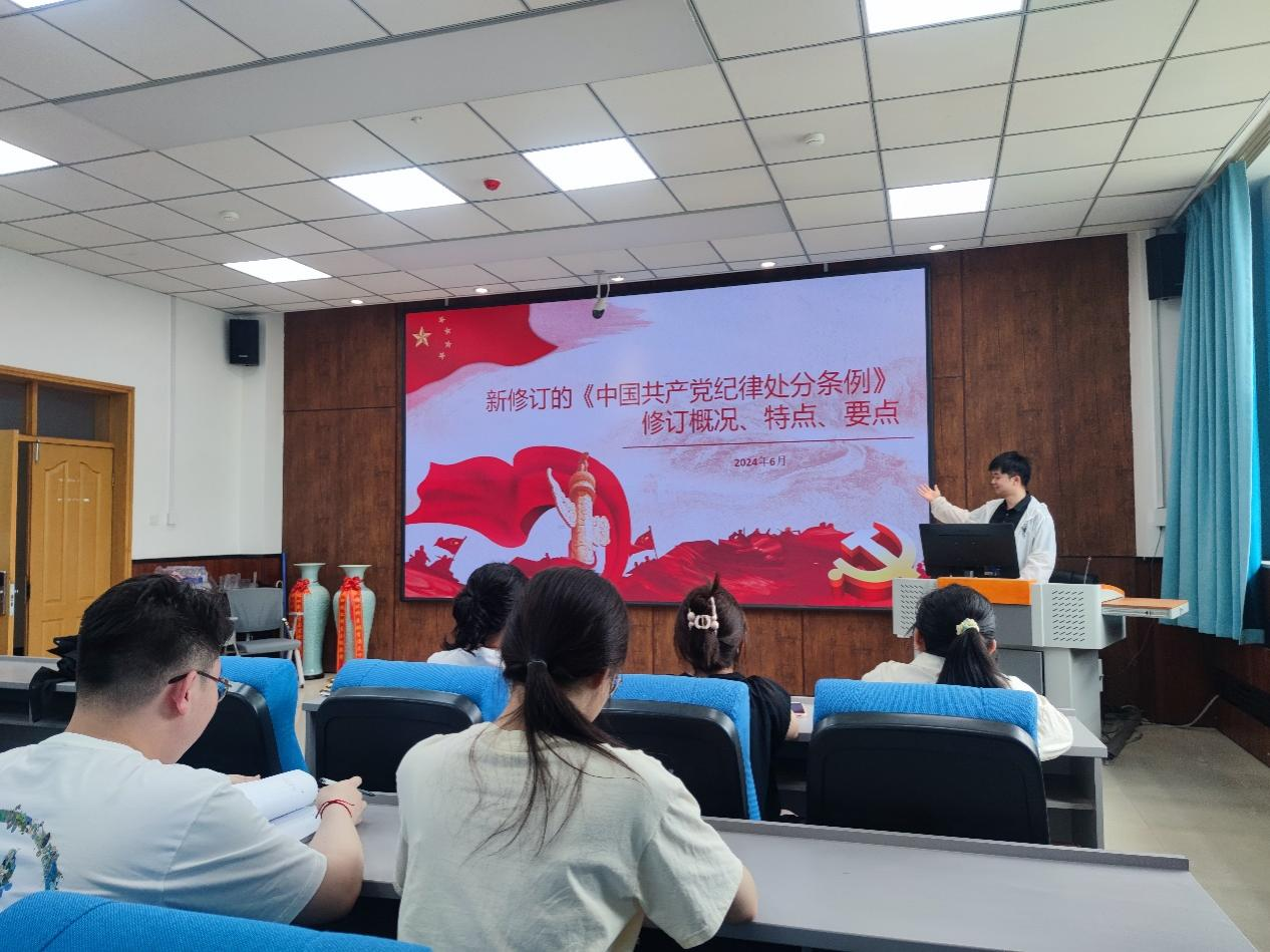 6月18日,地下水-水文-新能源教工党支部书记王福刚为支部全体党员讲授了一堂内容丰富、引人深思的党纪学习教育课。在课堂上,他对《中国共产党纪律处分条例》的内容、修改背景、重要意义等方面进行了详细解读,并结合身边实际案例对不同方面进行了阐述。支部党员纷纷表示,作为高校教育工作者,更要严格遵守党纪规定,以更强的党性、更踏实的作风为高校教育和科研事业贡献力量。