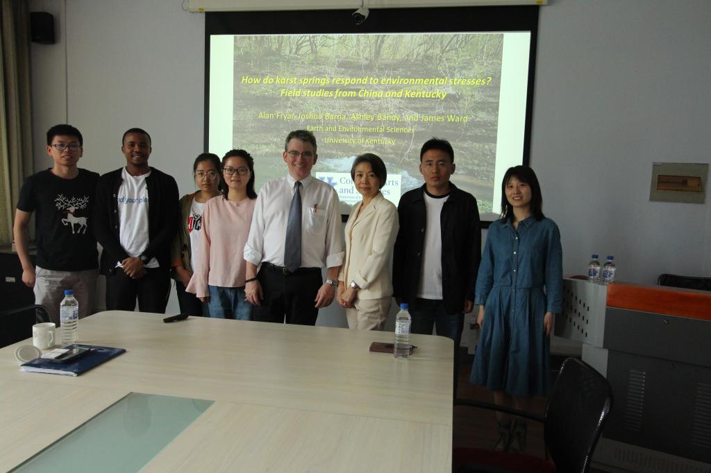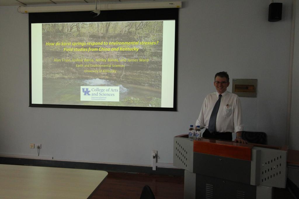 下午,Alan 教授与bat365官网登录入口师生作题为“How do Karst Spring Response to Environmental Stresses? Field Studies from China and Kentucky (中国与肯塔基典型岩溶泉对环境变化的影响机理)”学术报告。此学术报告由地下水科学与工程系李鸿雁教授主持,在报告会上,Alan 教授阐述了肯塔基州岩溶泉的特点及对环境变化的影响,并与贵州省岩溶泉的特点为例向师生们分享了对比差异。师生们对Alan教授的研究课题表示很感兴趣,并与Alan 教授就报告研究方向进行了深入探讨,收获颇丰。