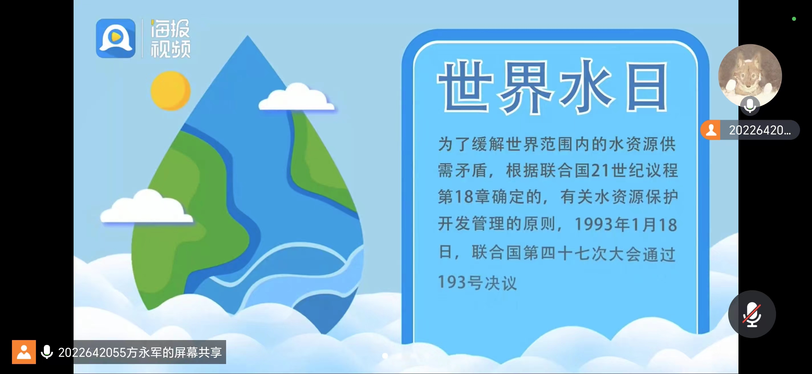 首先,团支部书记方永军播放了一则介绍世界水日与中国水周由来的视频。1993年1月18日,第47届联合国大会确定每年3月22日为世界水日,其宗旨是唤起公众的节水意识,加强保护水资源。自1993年“世界水日”确定后,从1994年起,水利部决定将每年“世界水日”即3月22日至3月28日的这一周,确定为“中国水周”,提高全社会关心水、珍惜水、保护水和水忧患意识,促进水资源的开发、利用、保护和管理。支部团员明白了世界水日与中国水周的建立是为了提高公众珍惜和保护水资源的意识。