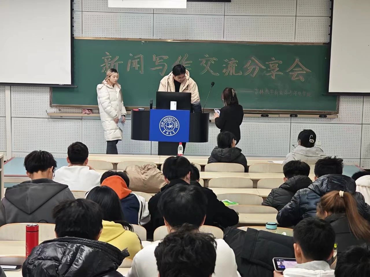 为提升学院宣传工作质量,并帮助团学组织新成员尽快熟悉新闻写作相关工作,bat365官网登录入口新媒体中心于11月16日在李四光教学楼104教室召开了新闻写作交流分享会。本次活动由学院新媒体中心主任王佳楠同学主持,全体团学组织成员参与,并邀请到文学院暨新闻与传播学院新闻中心主任刘晨欣同学、闫梓锋同学以及新闻中心副主任刘奕麟同学。其中,刘晨欣同学作为主讲人为大家分享了新闻写作经验。