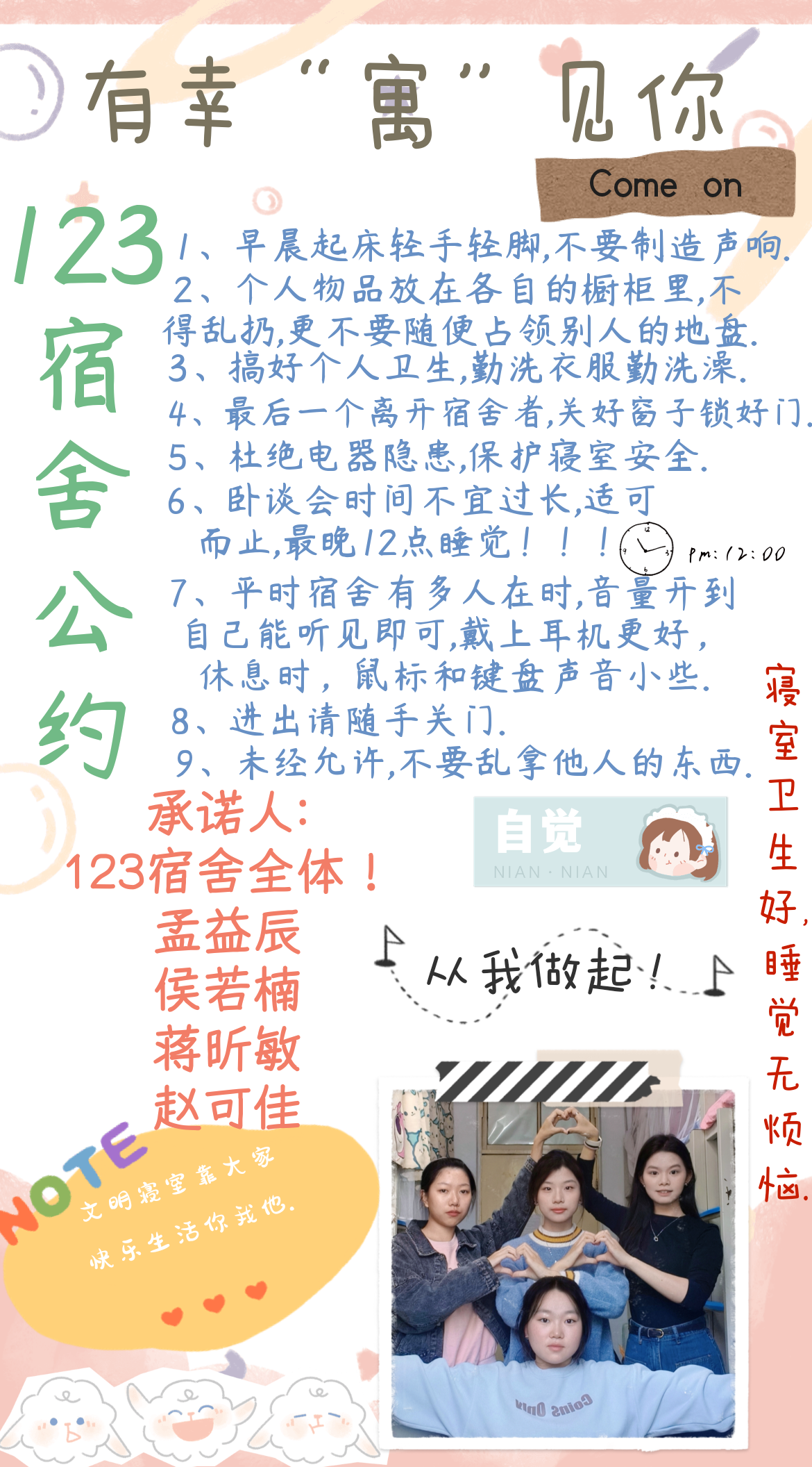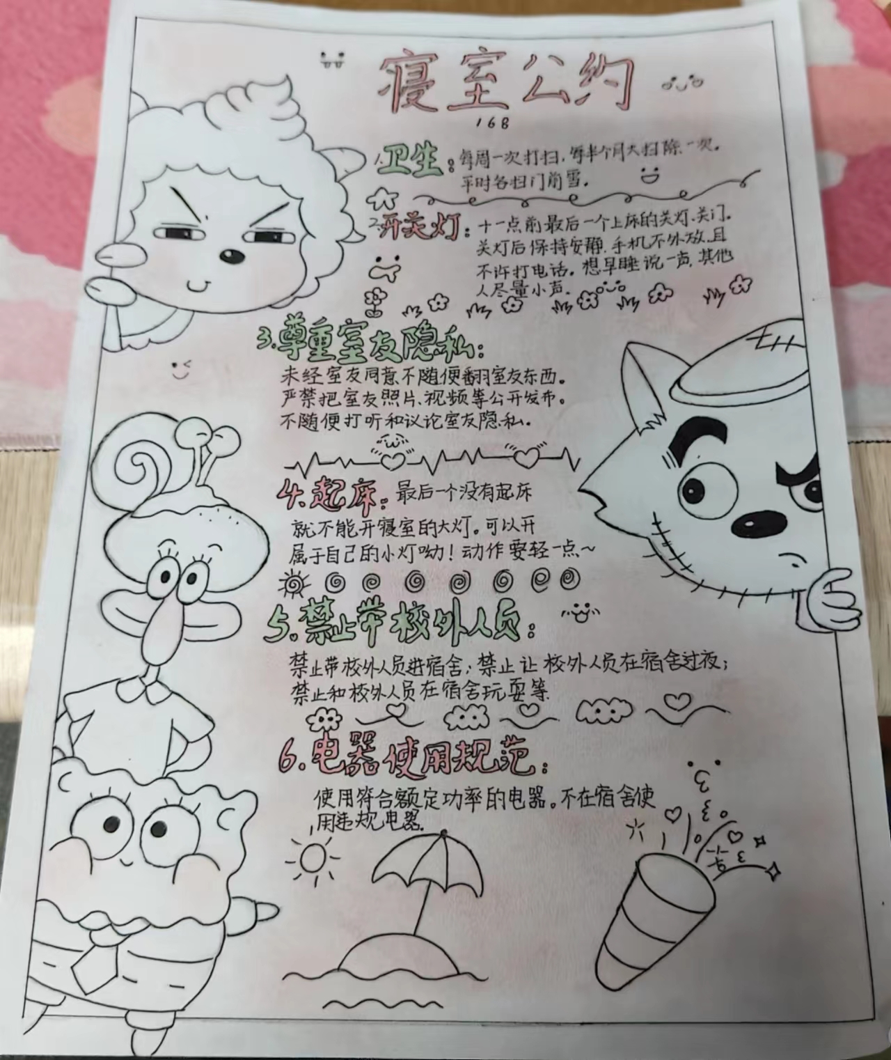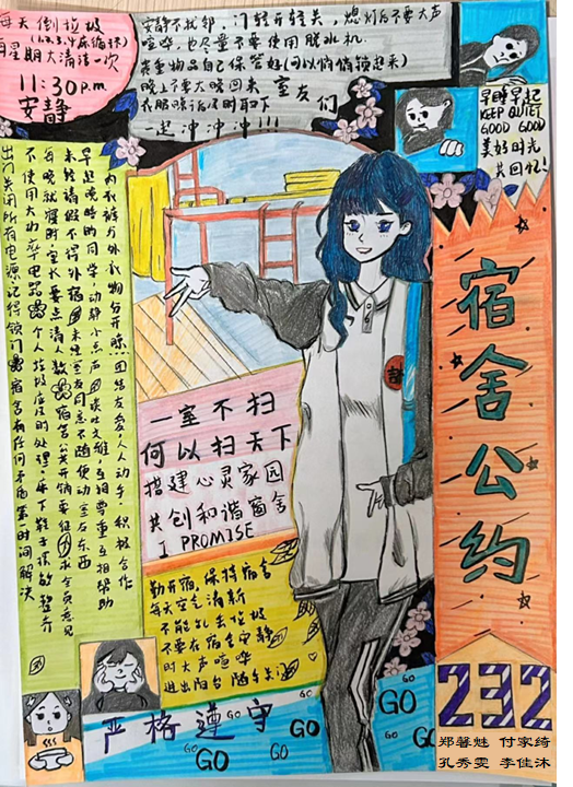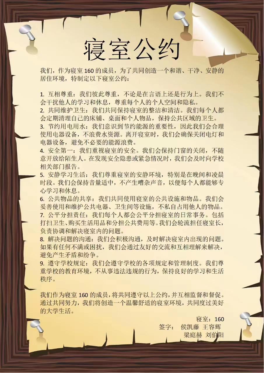 为进一步加强公寓文化建设,发挥公寓育人阵地作用,推动学生寝室制度化、有序化管理,引导学生养成良好的生活习惯,营造文明和谐、干净整洁的寝室文化氛围,bat365官网登录入口面向全体2023级本科生举办寝室公约创建活动,以多种多样的形式围绕宿舍卫生、校规校纪、学习氛围、作息时间等方面进行设计,涌现出一大批优秀的寝室公约。(以下排名不分先后)