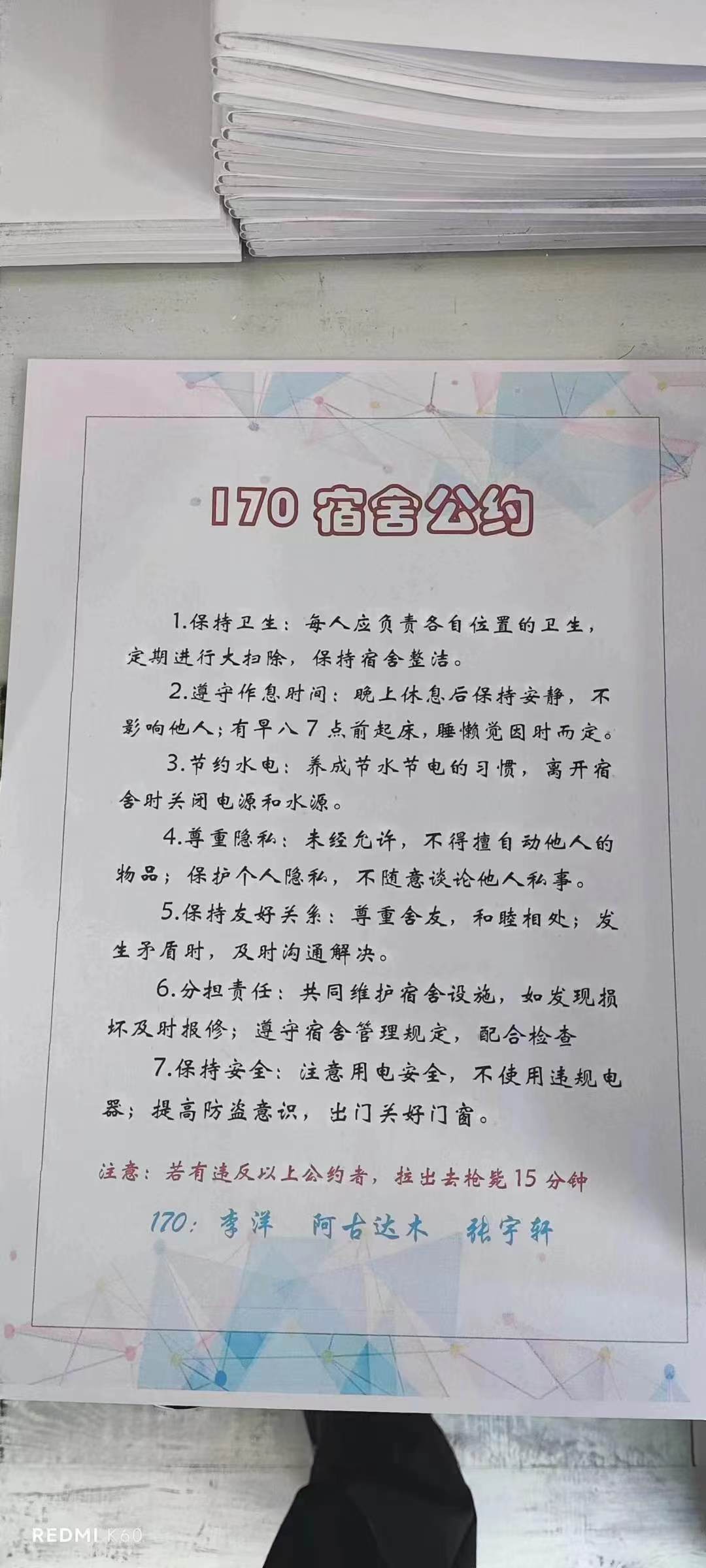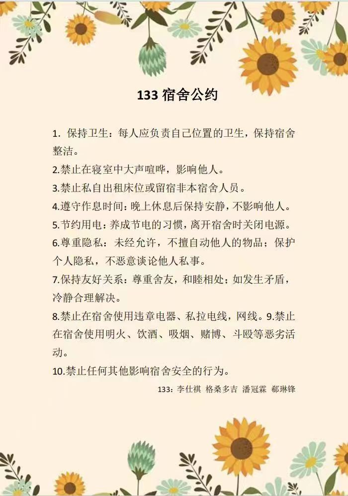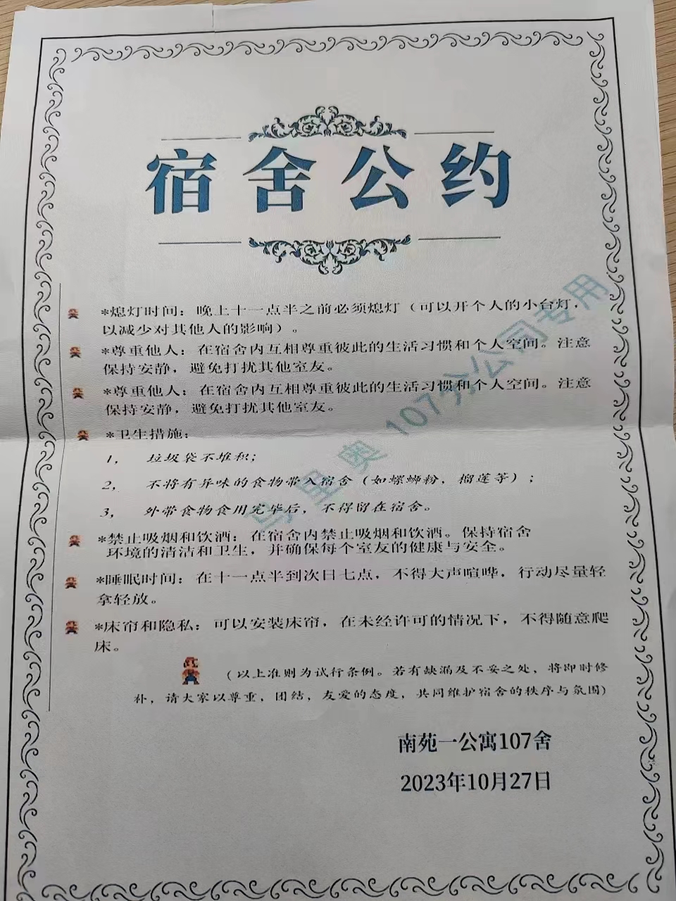 为进一步加强公寓文化建设,发挥公寓育人阵地作用,推动学生寝室制度化、有序化管理,引导学生养成良好的生活习惯,营造文明和谐、干净整洁的寝室文化氛围,bat365官网登录入口面向全体2023级本科生举办寝室公约创建活动,以多种多样的形式围绕宿舍卫生、校规校纪、学习氛围、作息时间等方面进行设计,涌现出一大批优秀的寝室公约。(以下排名不分先后)