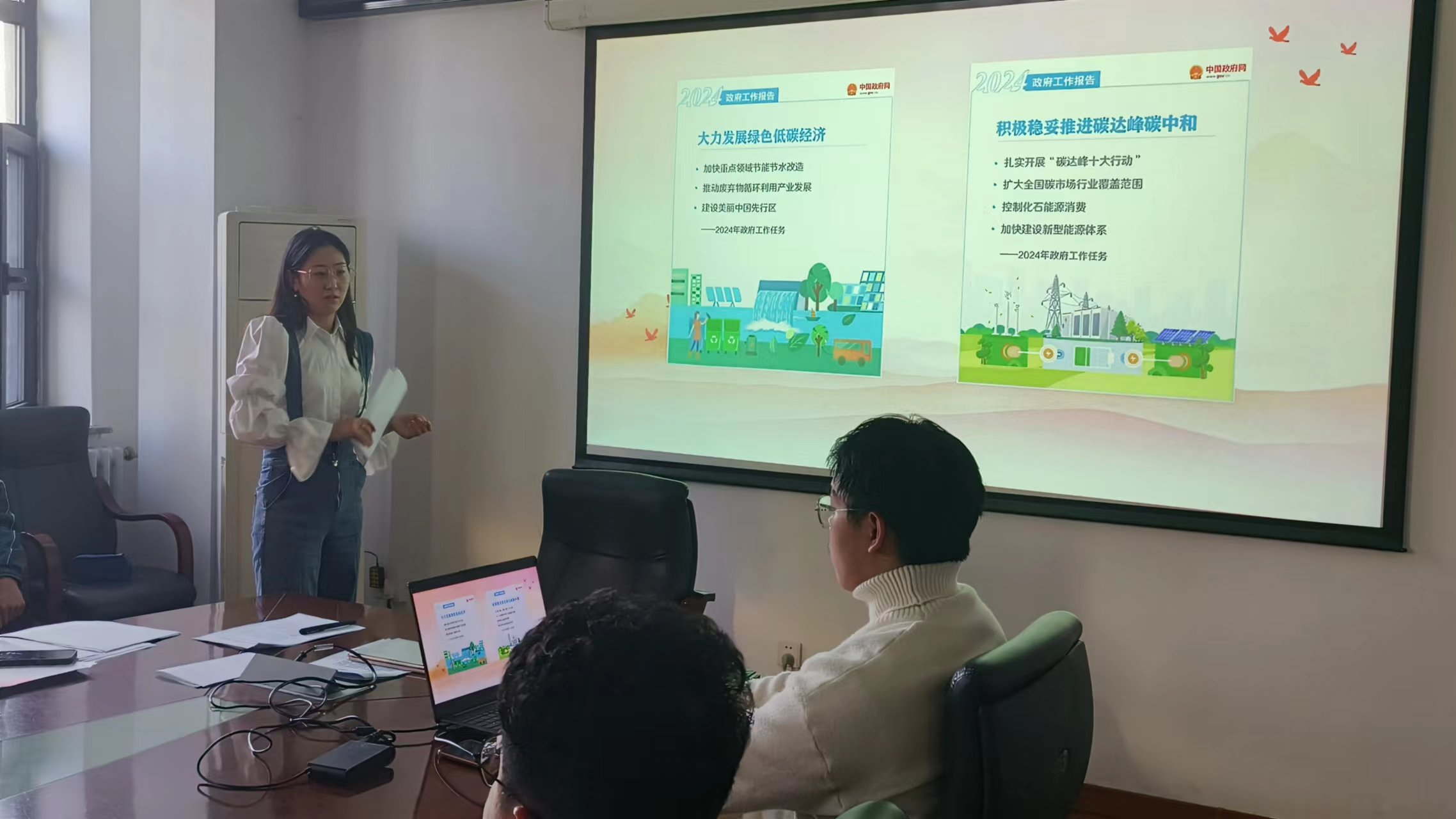 第十四届全国人大代表大会第二次会议开幕会上,国务院总理李强代表国务院作《2024年政府工作报告》,报告从7个方面进行了2023年的工作回顾,指出了2024年经济社会发展总体要求和政策取向,明确了2024年政府十项工作任务,全文涉及多处“生态文明建设”相关内容。活动中,李老师带领党员同志们共同研读了本次报告,强调了我党对强化生态环境保护治理提出的新要求新举措,重点讲述了2024年政府工作任务中“加强生态文明建设,推进绿色低碳发展”的相关内容。为了让同学们更直观的学习,李老师组织与会党员共同观看《生态文明,全球共赢》短片,进一步学习了解近平生态文明思想精神深刻含义。2020年,习近平总书记在第七十五届联合国大会上对世界郑重承诺:“中国将提高国家自主贡献力度,采取更加有力的政策和措施,二氧化碳排放力争于2030年前达到峰值,努力争取2060年前实现碳中和。”为实现这一庄严承诺,向世界人民展现大国担当,全国人民在党中央的带领下,建设节能工程和低碳产业,深入开展污染防治攻坚战。