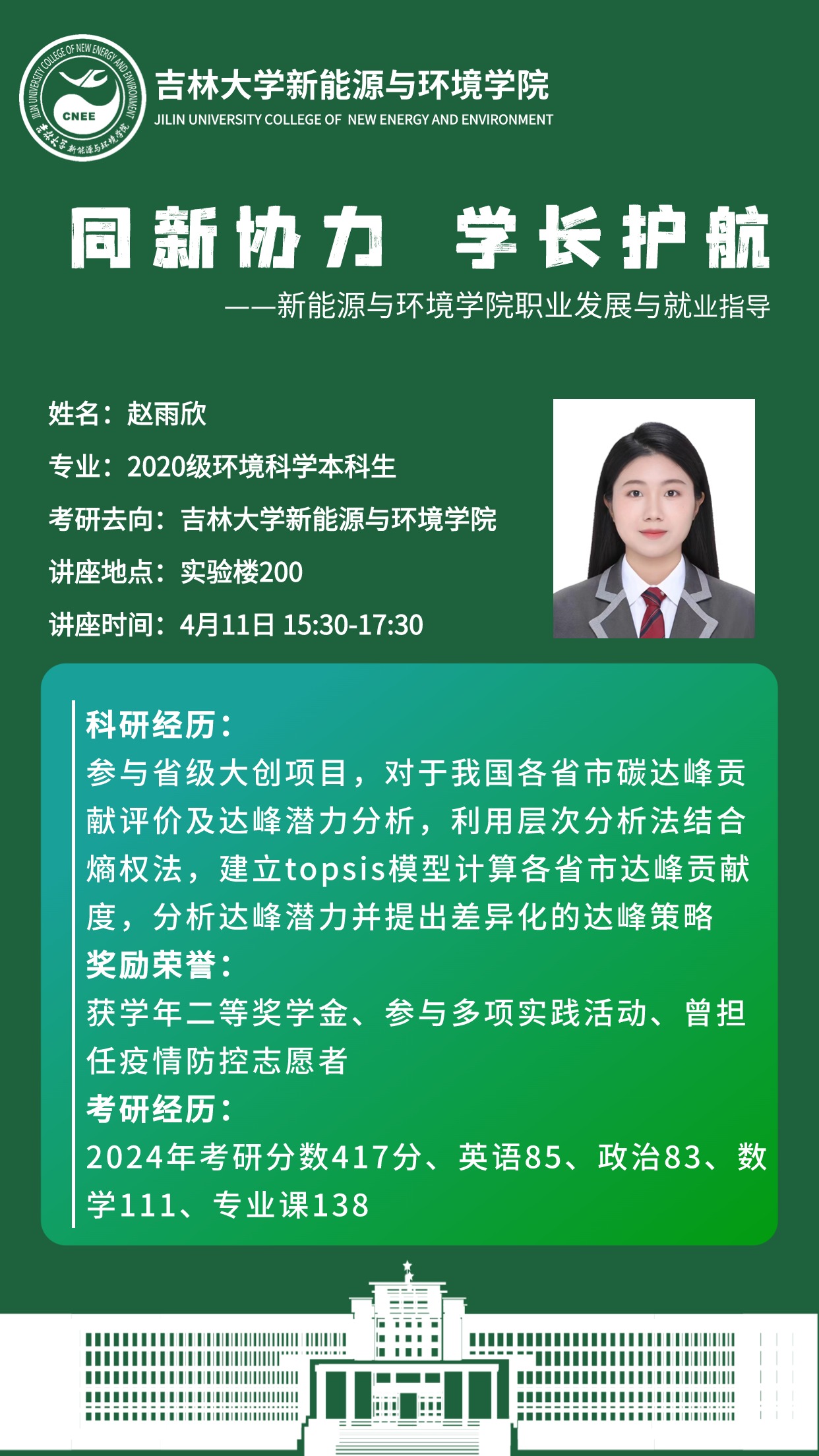 为加强本科学生对行业发展趋势的认识,梳理出更符合自身发展的成长路径,有效地指导我院学生进行生涯规划与职业选择,2024年4月11日下午,bat365官网登录入口在朝阳校区实验楼200教室举办了“同新协力 学长护航”大学生职业发展与就业创业指导专题讲座,朝阳校区2021级全体本科生参与本次活动,辅导员李薇老师担任主持人.