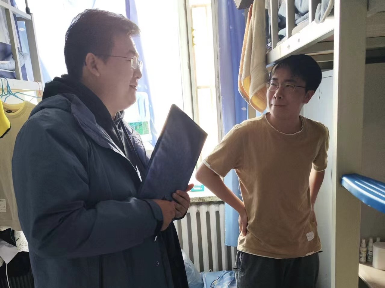4月15日,2023级辅导员姜岳彤老师进入中心校区南苑二公寓21间寝室,对同学们近期学习状态,转专业学生的适应程度进行了解,并提醒同学们注意寝室卫生。同日,姜老师又深入环境类《分析化学》课堂,同任课教师了解教学进度及学生学习情况,本次课程118人全部按时到课。