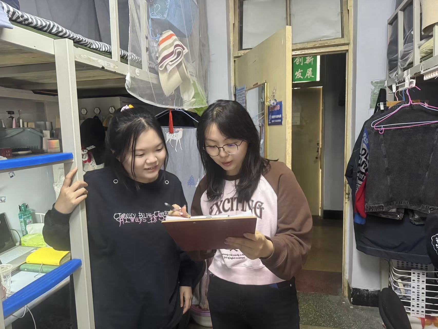 4月19日,2020级辅导员霍美汐老师对南区南苑一、南苑二公寓18间寝室进行检查,本次检查重点为寝室卫生,除部分寝室个别位置较为脏乱外,大部分寝室卫生状态良好,没有发现违章电器。