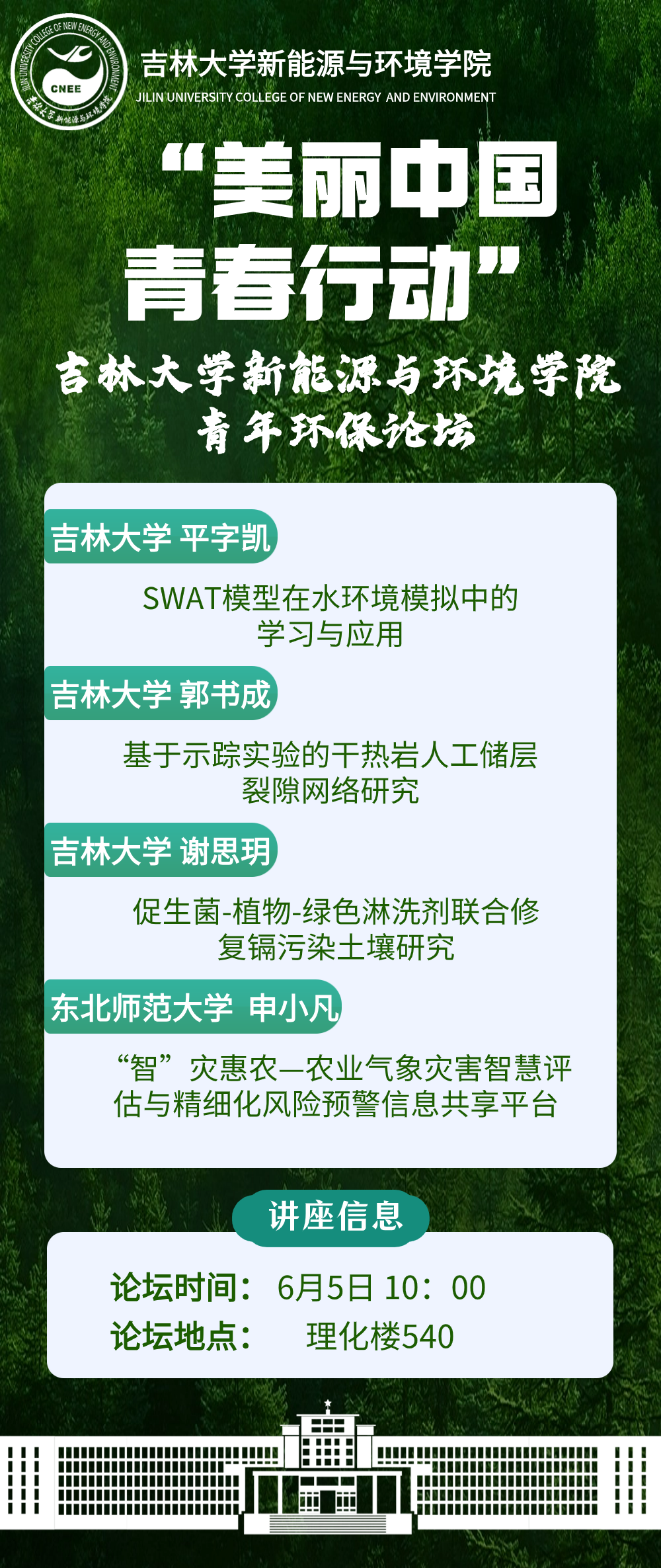 期待各位有志青年以青年环保论坛为契机,将环保理念融入日常生活,加强专业知识学习,积极参与环保实践,共同为“打赢碧水、蓝天、净土保卫战,建设清洁美丽绿色中国”投身青年行动贡献青春力量。
