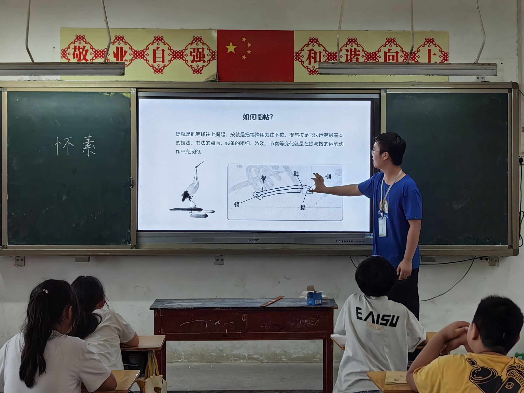 书法是一种独特的艺术形式,它通过线条和构图的变化,传达出情感、文化和美的信息在书法课上,同学们首先学习了正确的握笔姿势和基本的笔画技法,然后开始练习书写简单的汉字。在这个过程中,同学们需要静下心来,专心致志地进行书写,以达到最佳的书写效果。课上,支教老师通过书法历史演变种类的讲述,列举每种书法名人故事,传授楷书和毛笔的学习技巧,向同学们讲述美,带领同学们鉴赏美。书法不仅是一门艺术,也是一种修身养性的方式,同学们通过书法课感受到中华文化的博大精深,体会文字之美,提高自己的审美情趣和文化素养更好地通过书写表达自己的情感和思想。