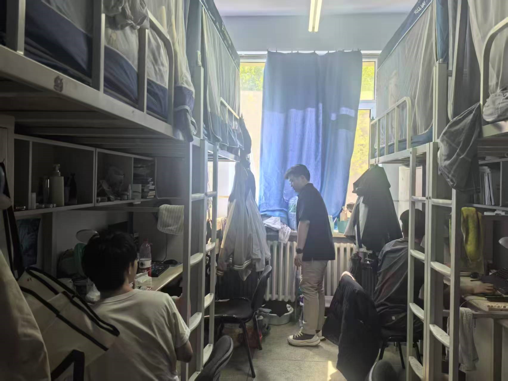 6月12日,2022级辅导员母茂松老师进入朝阳七公寓检查消防安全和寝室卫生,提醒学生及时整理寝室卫生,做好期末学习考试准备。