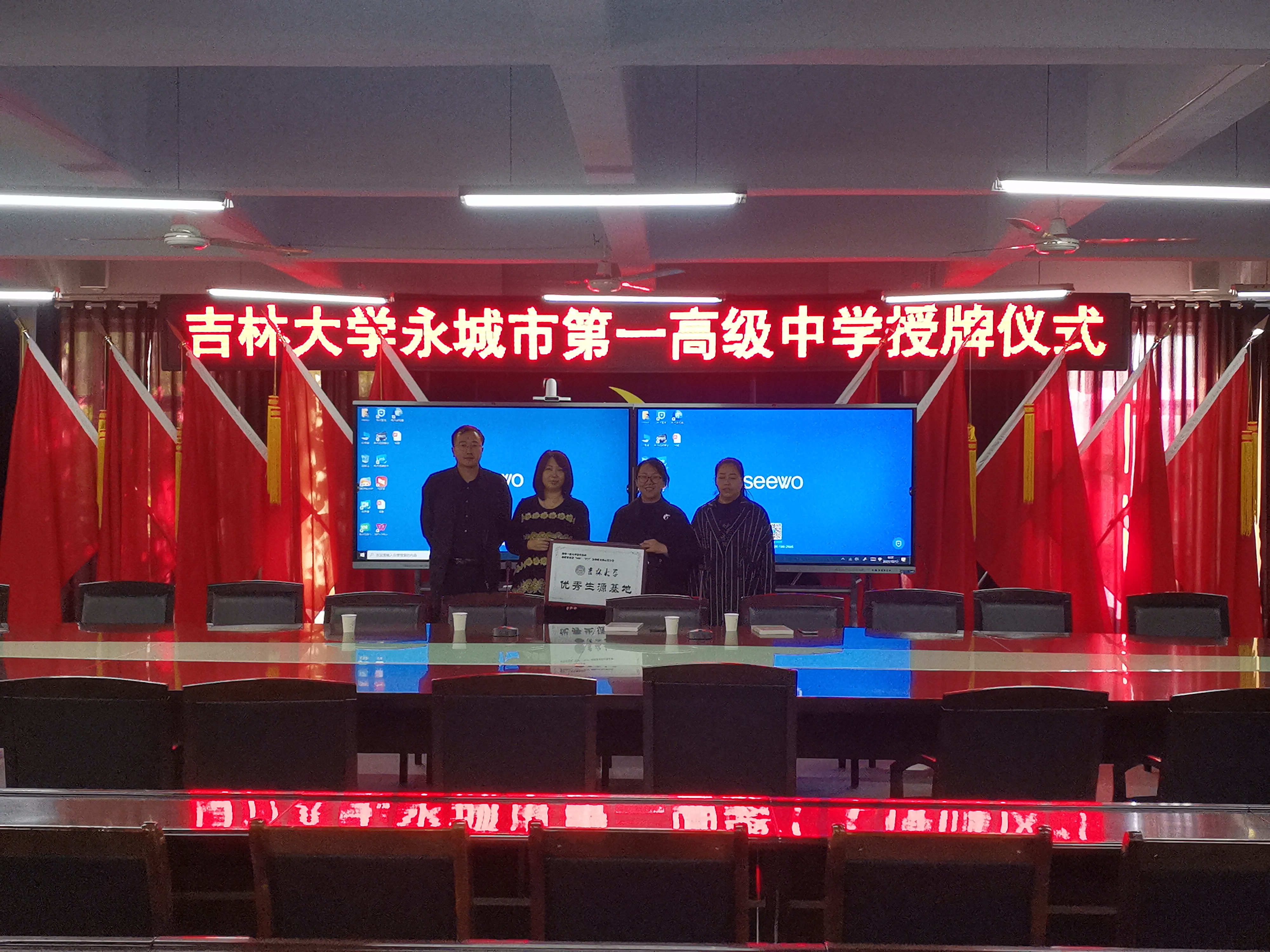 在永城市第一高级中学,吴哲副书记与永城一高党委成员、纪委书记杨柳,永城一高宣传办公室主任陈艳梅进行了座谈,杨书记表示吉林大学是一所知名的国家重点建设的“双一流”高校,欢迎吉林大学到校做招生宣传,希望有更多的学生成功报考吉林大学。吴哲副书记则介绍了吉林大学的教育、学科、就业等多方面优势,同时感谢永城一中为吉林大学输送了许多优秀的学子,并向永城市第一高级中学授予了“吉林大学优秀生源基地”牌匾。