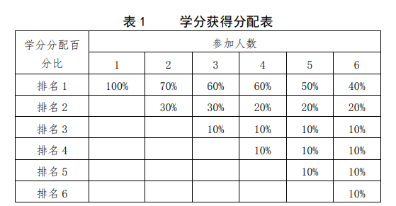 5.学生按照成果完成人顺序不同(除明确学分分配原则外)按照学分分配表格获得学分(依表1)。学生参加大学生创新创业训练项目结题、参加校级及以上学科竞赛,所得分值全校统一。参加大学生创新创业训练计划项目,学生按照项目结题结果及成员排名取得学分(依表2);学科竞赛获奖,团队成员获得相同的学分(依表3)。